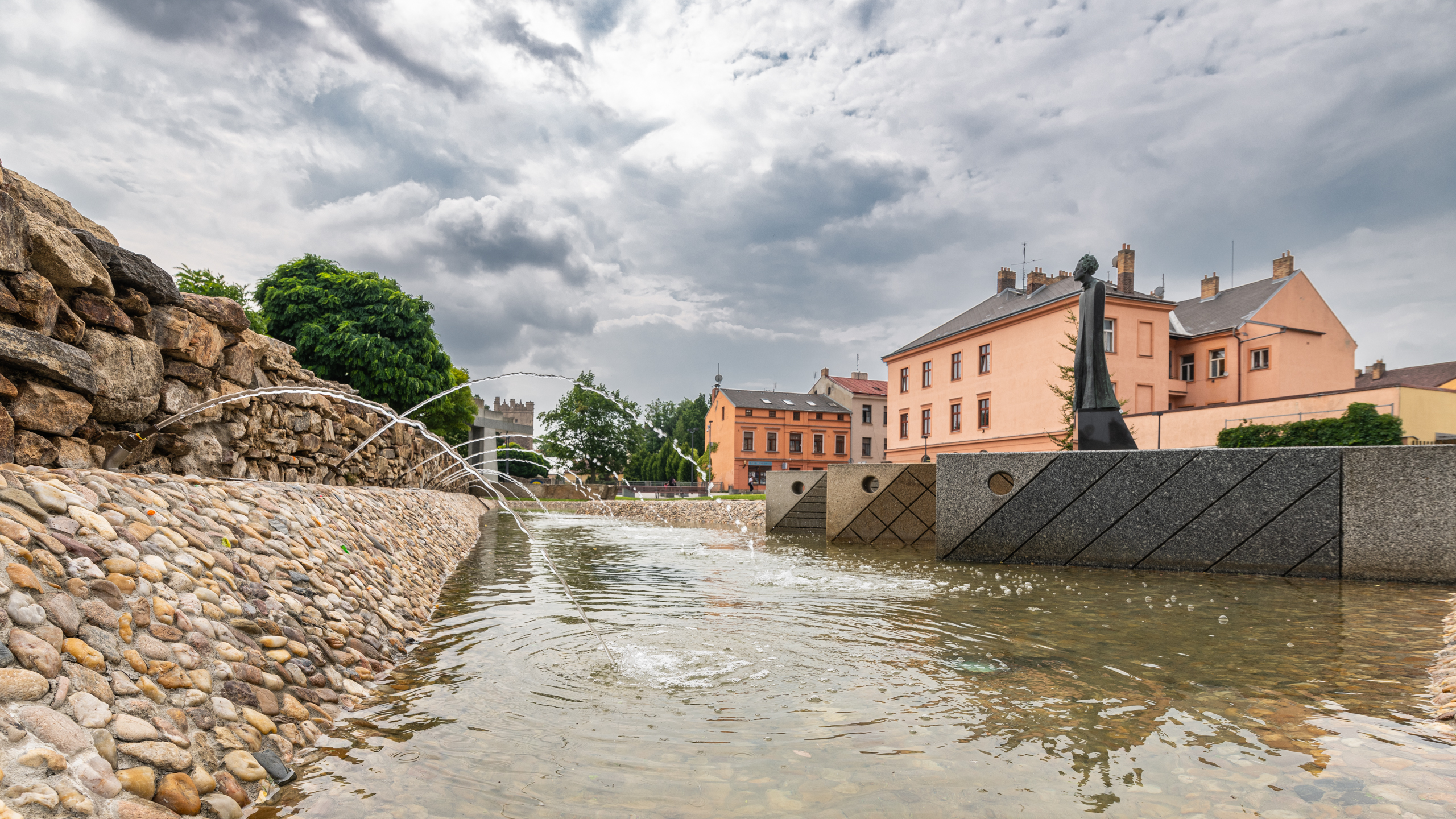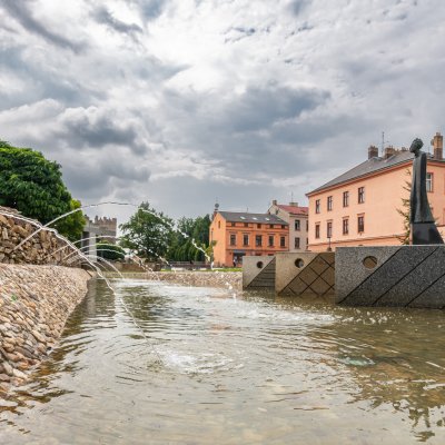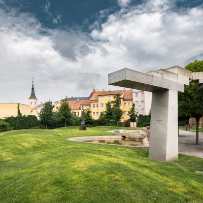 Architektonická kompozice parku je pojata jako kontrast krajiny s městem. Voda a zvlněné travnaté plochy vedle ostře tvarovaných forem a kamenných prvků se tu potkávají s historií místa – s plochou hradebního parkánu, linií městských hradeb a odkrytými základy vypálené synagogy. Pohled shora nabízí vyhlídka v historické baště opevnění.