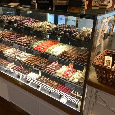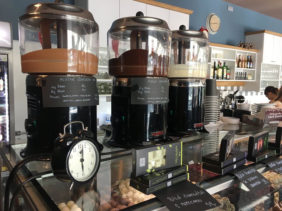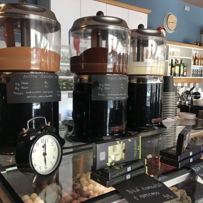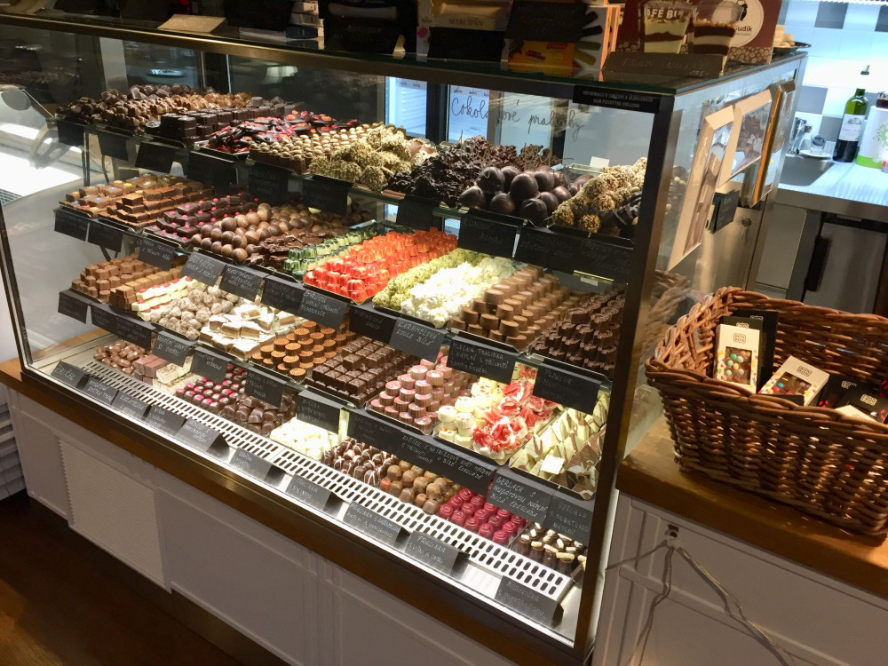 Kavárna je vyhlášená svými čokoládovými bonbóny a pralinkami vlastní výroby.