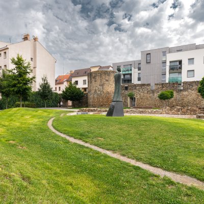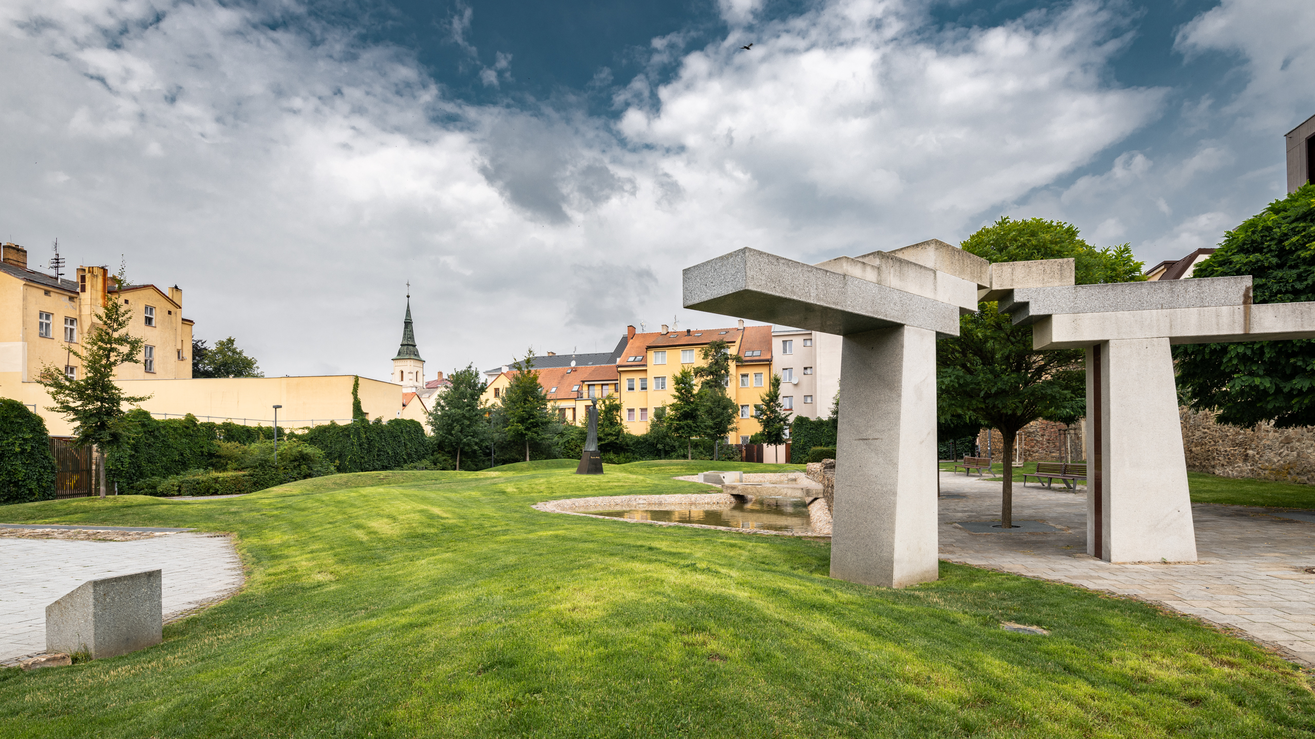 Architektonická kompozice parku je pojata jako kontrast krajiny s městem. Voda a zvlněné travnaté plochy vedle ostře tvarovaných forem a kamenných prvků se tu potkávají s historií místa – s plochou hradebního parkánu, linií městských hradeb a odkrytými základy vypálené synagogy. Pohled shora nabízí vyhlídka v historické baště opevnění.