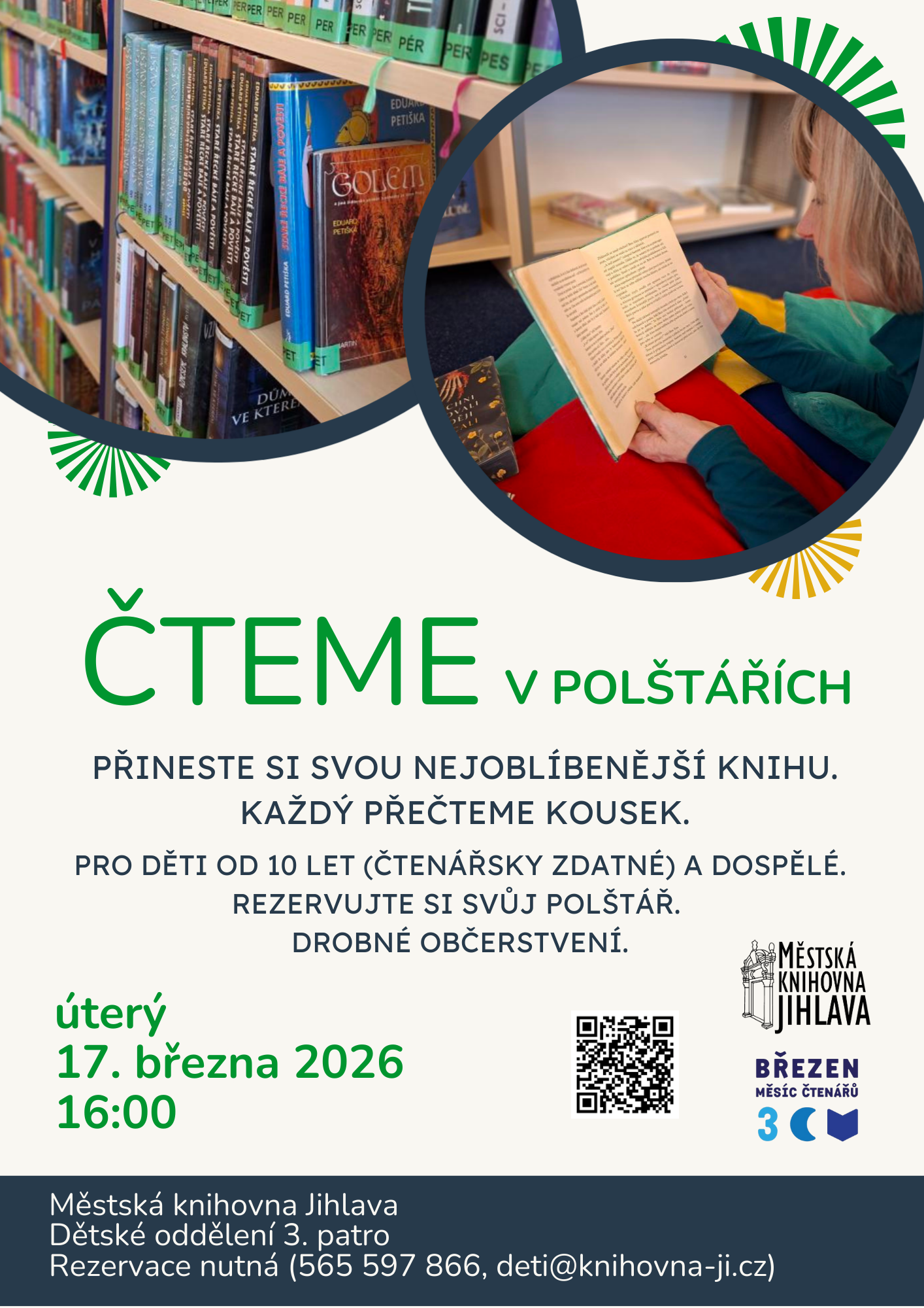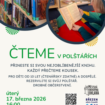 I když máme v úterý odpoledne běžně zavřeno, 17. března pro vás knihovnu otevřeme – a pozveme vás rovnou do polštářů. Čeká nás totiž to nejlepší, co se dá v knihovně dělat: společné čtení.