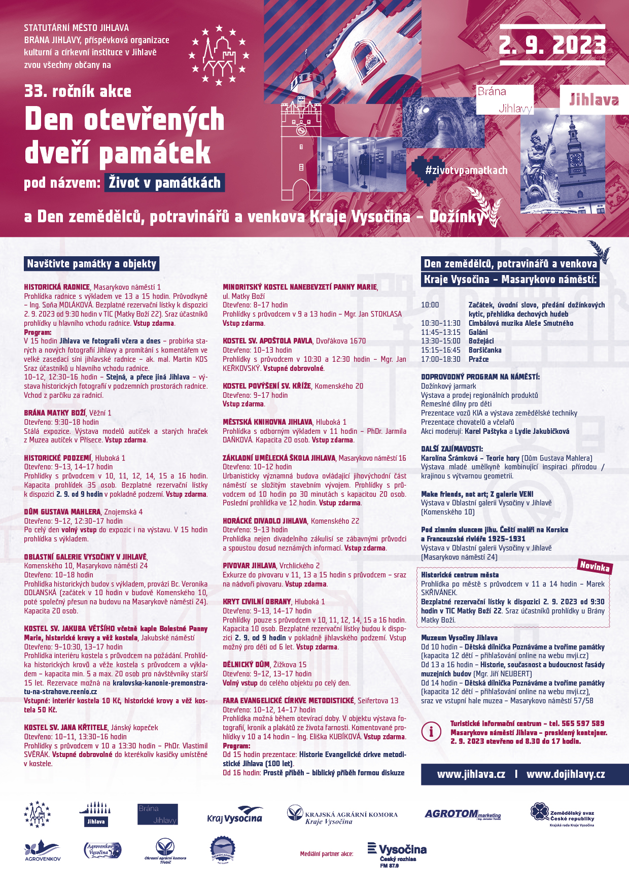 V sobotu 2. 9. proběhne na Masarykově náměstí v Jihlavě proběhnou Dožínky a dožínkový jarmark - Den zemědělců, potravinářů a venkova Kraje Vysočina. Oslavu regionálních farmářů a jejich výrobků a tradiční udílení cen Regionální potraviny Kraje Vysočina doplní program s živou hudbou, řemeslné trhy, výstava drobných a hospodářských zvířat apod.